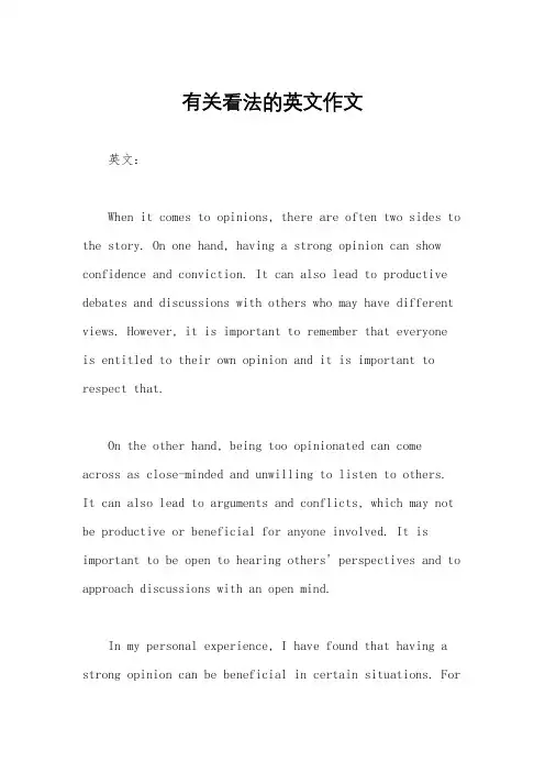 有关看法的英文作文英文:When it comes to opinions, there are often two sides to the story. On one hand, having a strong opinion can show confidence and conviction. It can also lead to productive debates and discussions with others who may have different views. However, it is important to remember that everyone is entitled to their own opinion and it is important to respect that.On the other hand, being too opinionated can come across as close-minded and unwilling to listen to others. It can also lead to arguments and conflicts, which may not be productive or beneficial for anyone involved. It is important to be open to hearing others' perspectives and to approach discussions with an open mind.In my personal experience, I have found that having a strong opinion can be beneficial in certain situations. Forexample, when working on a group project, having a clear idea of what I believe can help guide the group towards a successful outcome. However, I have also learned the valueof listening to others and being open to new ideas. Thishas helped me to grow and learn from others, as well as avoid unnecessary conflicts.中文:谈到看法,往往有两面性。