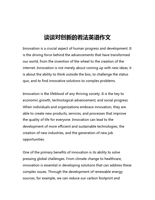 谈谈对创新的看法英语作文Innovation is a crucial aspect of human progress and development. It is the driving force behind the advancements that have transformed our world, from the invention of the wheel to the creation of the internet. Innovation is not merely about coming up with new ideas; it is about the ability to think outside the box, to challenge the status quo, and to find innovative solutions to complex problems.Innovation is the lifeblood of any thriving society. It is the key to economic growth, technological advancement, and social progress. When individuals and organizations embrace innovation, they are able to create new products, services, and processes that improve the quality of life for everyone. Innovation can lead to the development of more efficient and sustainable technologies, the creation of new industries, and the generation of new job opportunities.One of the primary benefits of innovation is its ability to solve pressing global challenges. From climate change to healthcare, innovation is essential in developing solutions that can address these complex issues. Through the development of renewable energy sources, for example, we can reduce our carbon footprint andmitigate the effects of climate change. Similarly, innovation in the medical field has led to the creation of life-saving drugs and treatments, improving the quality of life for millions of people around the world.Innovation also plays a crucial role in fostering economic growth and competitiveness. Businesses that are able to innovate and stay ahead of the curve are more likely to succeed in the global marketplace. By developing new products and services, they can differentiate themselves from their competitors and meet the changing needs and preferences of consumers. This, in turn, can lead to increased market share, higher profits, and greater economic prosperity.However, the process of innovation is not without its challenges. Developing new ideas and bringing them to fruition can be a complex and resource-intensive undertaking. It requires a willingness to take risks, a tolerance for failure, and a commitment to perseverance. Additionally, there are often cultural and institutional barriers that can hinder the innovation process, such as resistance to change, lack of funding, or inadequate support for research and development.Despite these challenges, it is essential that we continue to foster a culture of innovation. This can be achieved through a variety of means, such as investing in education and training, encouragingentrepreneurship and risk-taking, and creating policies and regulations that support innovation. Governments, businesses, and individuals all have a role to play in cultivating an environment that is conducive to innovation.One of the key drivers of innovation is the diversity of perspectives and ideas. When people from different backgrounds and experiences come together to collaborate, they are able to generate new insights and solutions that may not have been possible otherwise. This is why it is so important to create inclusive and diverse environments that encourage the exchange of ideas and the cross-pollination of knowledge.Another important aspect of innovation is the ability to learn from failure. In the pursuit of new ideas and solutions, it is inevitable that we will encounter setbacks and failures. However, it is how we respond to these failures that can make all the difference. By embracing a culture of learning and continuous improvement, we can use these failures as opportunities to refine our ideas, improve our processes, and ultimately, achieve greater success.In conclusion, innovation is a crucial component of human progress and development. It is the driving force behind the advancements that have transformed our world and the key to addressing the complex challenges that we face. By fostering a culture of innovation,embracing diversity, and learning from our failures, we can continue to push the boundaries of what is possible and create a better future for all.。