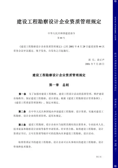 建设工程勘察设计企业资质管理规定中华人民共和国建设部令第160号《建设工程勘察设计资质管理规定》已于2006年12月30日经建设部第114次常务会议讨论通过,现予发布,自2007年9月1日起施行。