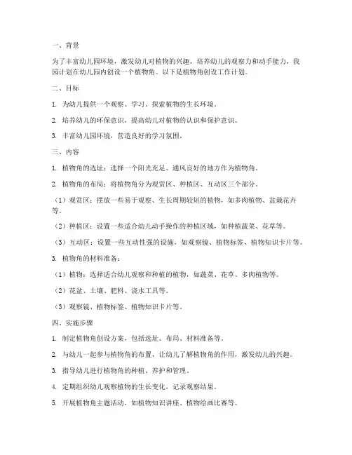 一、背景为了丰富幼儿园环境,激发幼儿对植物的兴趣,培养幼儿的观察力和动手能力,我园计划在幼儿园内创设一个植物角。