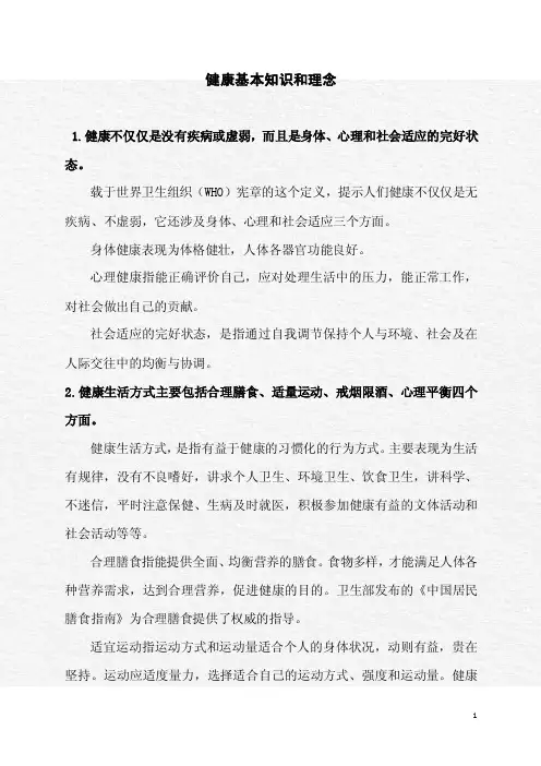 一、基本知识和理念1.健康不仅仅是没有疾病或虚弱,而是身体、心理和社会适应的完好状态。