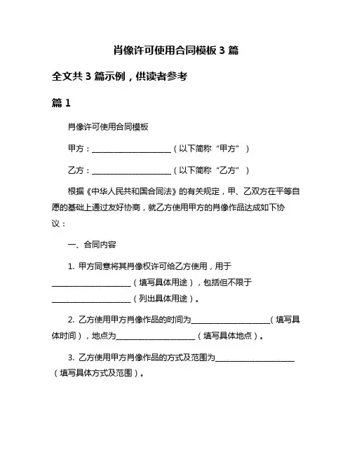 四、违约责任及争议解决方式篇2甲方(肖像权人):____________________乙方(被授权人):____________________根据中华人民共和国有关法律、法规,甲乙双方在平等、自愿、协商一致的基础上,就甲方肖像许可乙方使用一事达成如下协议,共同遵照执行:一、协议目的及内容本协议旨在对甲方肖像的使用做出明确的约定,保护双方的合法权益,确保甲方肖像得到合法、正当的使用。