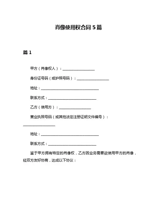 肖像使用协议书5篇篇1甲方(肖像权人):____________________乙方(肖像被使用人):____________________鉴于甲方拥有特定的肖像权,并希望在其相关事务中使用乙方肖像,同时乙方同意甲方在特定条件下使用其肖像,经双方友好协商,达成以下协议:一、协议目的本协议旨在明确甲方在特定情况下使用乙方肖像的权利及义务,保护双方的合法权益。