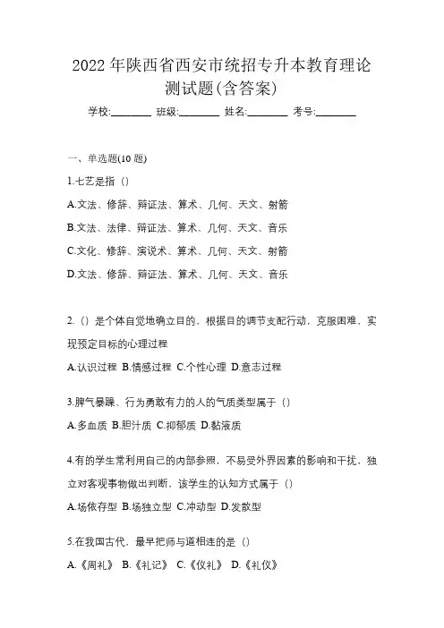2022年陕西省西安市统招专升本教育理论测试题(含答案)学校:________ 班级:________ 姓名:________ 考号:________一、单选题(10题)1.七艺是指()A.文法、修辞、辩证法、算术、几何、天文、射箭B.文法、法律、辩证法、算术、几何、天文、音乐C.文化、修辞、演说术、算术、几何、天文、射箭D.文法、修辞、辩证法、算术、几何、天文、音乐2.()是个体自觉地确立目的,根据目的调节支配行动,克服困难,实现预定目标的心理过程A.认识过程B.情感过程C.个性心理D.意志过程3.脾气暴躁、行为勇敢有力的人的气质类型属于()A.多血质B.胆汁质C.抑郁质D.黏液质4.有的学生常利用自己的内部参照,不易受外界因素的影响和干扰,独立对客观事物做出判断,该学生的认知方式属于()A.场依存型B.场独立型C.冲动型D.发散型5.在我国古代,最早把师与道相连的是()A.《周礼》B.《礼记》C.《仪礼》D.《礼仪》6.我国自()开始,教育才从封建社会的母腹中摆脱出来,走上了现代化的发展轨道A.壬寅学制B.癸卯学制C.癸丑学制D.六三三学制7.教师职业在国家或民族政治生活中所处的地位和所起的作用,体现了教师职业的()A.政治地位B.经济地位C.社会地位D.法律地位8.明确提出使人类教育心理学化的口号,为近代教育学的创立做出贡献的是()A.康德B.裴斯泰洛齐C.洛克D.夸美纽斯9.探寻抗战足迹,参观抗战纪念地、纪念馆等属于()A.说服教育法B.指导实践法C.品德评价法D.个人修养法10.马克思主义教育学在教育起源问题上坚持()A.劳动起源论B.生物起源论C.心理起源论D.生物进化论二、填空题(10题)11.基础教育课程改革所倡导的研究性学习、合作学习、自主学习等教学方式,其主要理论依据是____理论12.教师备课时必须写好的三种计划是____、课题(单元)计划和课时计划13.从形式上看,教育经过了从非形式化教育到形式化教育再到____的过程14.学生的品德包含知、情、意、____四个要素15.教师是教育者,教师职业是促进____的职业16.提出需要层次理论的心理学家是____17.韦克斯勒革新了智商的计算方法,将比率智商改为____智商18.____是学生在教师指导下,利用一定的仪器设备或材料,进行独立操作,观察事物和过程的变化情况,以获得知识、培养操作能力的方法19.在影响人身心发展的因素中,____起主导作用20.英国哲学家____认为儿童是一块“空白的石板”,父母和教师可以在石板上书写任何东西,创造出他们所希望的人。