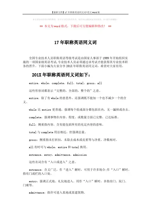 职称英语综合类考试词汇同义词汇总prohibit——ban制止, 阻止proposed——suggested被提议的intimate——friendly亲密的isolated——solitary隔离的,孤立的, 单独insist on——demand坚持, 坚决要求investigated——looked into调查, 研究in conjunction——together共同, 一起, 合起来harness——utilize利用hailed——alaimed向...欢呼, 致敬, 招呼hazard——danger冒险, 危险, 冒险的事horrify——terrify 使恐怖, 恐吓gets up——arises发生,出现,站立grasped——took hold of抓住, 抓紧, 掌握, 领会gained——put on得到,增进,获得gorgeous——lovely华美的, 灿烂的immediately——right away立即, 马上, 直接地inevitable——certain不可防止的, 必然的practically——almost几乎, 差不多physician——doctor医师, 内科医师postulated——assumed要求, 假定preserve——keep保护, 保持, 保存, 保藏previously——before先前, 以前pulled up——stopped拔起, 停下, 阻止puzzle——mystery神秘,谜perceive——notice感知, 感到, 认识到possessed——owned占有, 拥有, 持有, 摆布, 支配particularly——especially独特地, 显着地pressing——urgent紧迫的phase——stage阶段, 状态, 相, 相位porcelain——china瓷器, 瓷prior to——before在前, 居先principal organizers——planners方案者persists——continues坚持, 持续quarter——fourth四分之一,方向, 地区, 季度, 一刻钟quit——give up v.放弃(念头、希望等), 停顿permitted——allowed许可, 允许, 准许insane——crazy患精神病的, 精神病患者的ingenious——clever机灵的, 有独创性的, 精制的invaluable——extremely无价的, 价值无法衡量的。