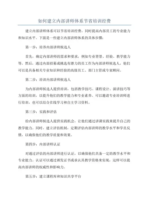 如何建立内部讲师体系节省培训经费建立内部讲师体系可以节省培训经费,同时提高内部员工的专业能力和知识水平。
