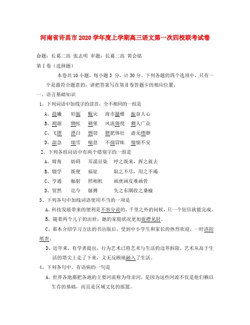 河南省许昌市2020学年度上学期高三语文第一次四校联考试卷命题:长葛二高张志明审题:长葛二高黄会铭第Ⅰ卷(选择题)本卷共10小题,每小题3 分,计30分。