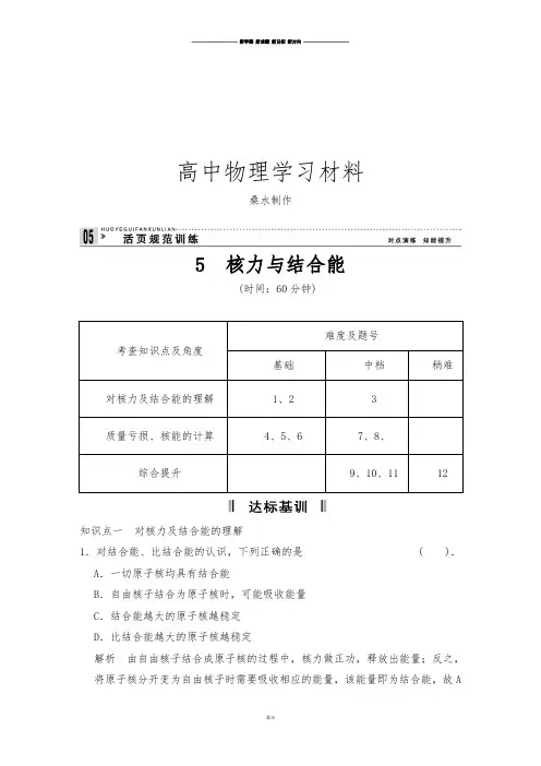 第5课核力与结合能备作业一、单选1.关于核力的说法正确的是( )A.核力同万有引力没有区别,都是物体间的作用B.核力就是电磁力C.核力是短程力,作用范围在1.5×10-15 m之内D.核力与电荷有关【解析】核力是短程力,超过1.5×10-15m.核力急剧下降几乎消失,故C对.核力与万有引力、电磁力不同,故A、B不对.核力与电荷无关,故D错.【答案】 C2.关于原子核的结合能与平均结合能,下列说法中不正确的是( )A.原子核的结合能等于核子与核子之间结合成原子核时,核力做的功B.原子核的结合能等于核子从原子核中分离,外力克服核力做的功C.比结合能是核子与核子结合成原子核时平均每个核子放出的能量D.不同原子核的比结合能不同,重核的比结合能比轻核的比结合能大答案:D 重核的比结合能比中等质量核的比结合能要小,轻核的比结合能也比中等质量核的比结合能要小,但重核的比结合能不一定比轻核的比结合能大,故D错误。