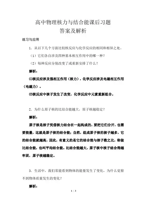 高中物理核力与结合能课后习题答案及解析练习与应用1.从以下几个方面比较核反应与化学反应的相同和相异之处。