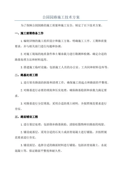 第1篇一、施工准备1. 设计图纸:根据园林规划,明确园路的位置、宽度、铺装材料及样式等。