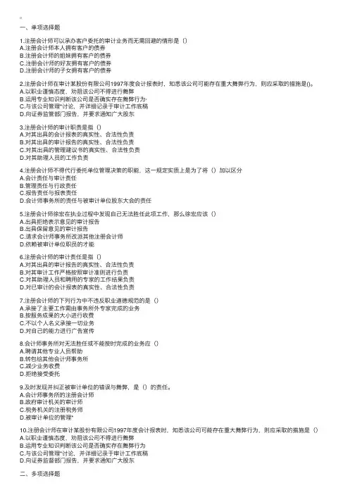 ⼀、单项选择题1.注册会计师可以承办客户委托的审计业务⽽⽆需回避的情形是()A.注册会计师本⼈拥有客户的债券B.注册会计师的姐妹拥有客户的债券C.注册会计师的好友拥有客户的债券D.注册会计师的⼦⼥拥有客户的债券2.注册会计师在审计某股份有限公司1997年度会计报表时,知悉该公司可能存在重⼤舞弊⾏为,则应采取的措施是()。