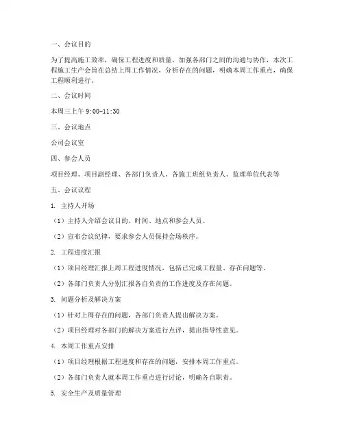 2. 会议目的生产会议的目的是为了讨论和解决与生产工作相关的问题,以确保生产计划的顺利进行。