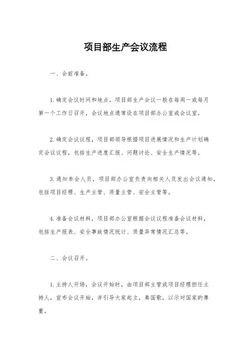 具体目的如下:•确定生产目标和计划•协调各部门之间的工作•分析生产过程中的问题和难点•制定解决方案和改进措施•监督和评估生产进展•交流和分享最佳实践经验3. 会议流程生产会议通常包括以下流程:3.1 准备会议议程在召开生产会议之前,主持人需要准备会议议程。