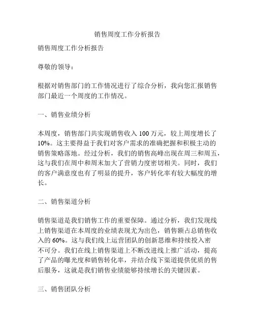 销售周度工作分析报告销售周度工作分析报告尊敬的领导:根据对销售部门的工作情况进行了综合分析,我向您汇报销售部门最近一个周度的工作情况。