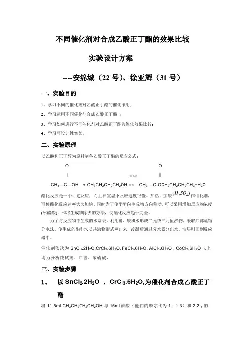 不同催化剂对合成乙酸正丁酯的效果比较实验设计方案----安绵城(22号)、徐亚辉(31号)一、实验目的1、学习不同的催化剂对乙酸正丁酯的催化作用;2、学习运用不同催化剂合成乙酸正丁酯 ;3、学习如何进行不同催化剂对乙酸正丁酯的催化效果比较;4、学习写设计性实验。