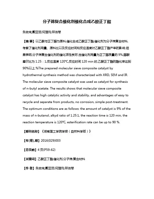 分子筛复合催化剂催化合成乙酸正丁酯朱政斌;戴亚丽;何理均;郑淑琴【摘要】以乙酸与正丁醇为原料,催化合成乙酸正丁酯,催化剂为分子筛复合材料,考察了催化剂用量、原料比以及反应时间和反应温度对乙酸正丁酯产率的影响.结果表明,分子筛复合催化剂的催化活性良好,当催化剂用量为正丁醇质量的9%,醇酸摩尔比为1.25:1,反应温度120℃,反应时间120 min时,乙酸正丁酯的酯化率达到90%以上.%The prepared molecular sieve composite catalyst by hydrothermal synthesis method was characterized with XRD, SEM and IR. The molecular sieve composite catalyst was used as catalyst for synthesis of n-butyl acetate. The results shows that molecular sieve composite catalyst has high catalytic activity and stability, and advantages of easy to recycle and separate from products, no corrosion, simple post-treatment. The optimum conditions are as follows: the amount of catalyst is 9% of the mass of n-butanol, alkyd ratio of 1.25:1, the reaction time is 120 min, the reaction temperature is 120℃, esterification rate can be up to 90 %.【期刊名称】《湖南理工学院学报(自然科学版)》【年(卷),期】2016(029)003【总页数】4页(P59-62)【关键词】乙酸正丁酯;催化剂;分子筛;复合材料【作者】朱政斌;戴亚丽;何理均;郑淑琴【作者单位】湖南理工学院化学化工学院,湖南岳阳 414006;岳阳市科学技术协会,湖南岳阳 414006;湖南理工学院化学化工学院,湖南岳阳 414006;湖南理工学院化学化工学院,湖南岳阳 414006【正文语种】中文【中图分类】TE624.5乙酸正丁酯是一种重要的精细化工原料,是一种有果香的无色透明液体,易挥发,难溶于水,能与乙醇和乙醚等有机溶剂混溶,溶于大多数烃类化合物,有麻醉作用. 其结构简式为CH3COO(CH2)3CH3. 乙酸正丁酯主要作为化工、香料等行业的重要原料,也可作为溶剂应用于涂料、皮革等行业[1~2].传统工业乙酸正丁酯的合成使用的催化剂为浓硫酸,它有较多的缺点,不符合绿色化学的观念. 随着催化领域工业技术的发展,产生了各种环境友好型催化剂,如无机盐、阳离子交换树脂、杂多酸、分子筛、固体超强酸和负载型催化剂等. 訾俊峰等[3]把AlCl3/NaHSO4作为催化剂,用量为2g,当乙酸用量为0.1mol,酸醇摩尔比为1:1.7,催化剂的n( AlCl3):n( NaHSO4)为1:1.5,带水剂为15mL环己烷,反应时间为120min时,其酯化率可达97%. 王俏[4]等研究了以硫酸钛为催化剂合成乙酸正丁酯,催化剂的用量为0.5g,醇酸摩尔比为1:1.14,反应时间1h,反应温度为110~115℃时,酯化产率可达94.1%. 高平强[5]等以自制的CeSAPO-5分子筛为催化剂,催化剂用量0.2g,带水剂用量5mL,酸醇物质的量比1:1,反应时间7h,反应温度95℃时,乙酸正丁酯的收率为90%. 田志茗[6]等以SZ/SBA-15为催化剂合成乙酸正丁酯,催化剂用量为0.375g,酸醇摩尔比为1:1.2,反应时间为1.5h,乙酸正丁酯产率为95.6%. 这些催化剂一般具选择性好、催化活性高、产品的收率高、重复使用效果好、对环境友好、不腐蚀设备等优点.在酯化反应催化剂的研发过程中,固体酸与分子筛是研究热点. 本文主要研究用于合成乙酸正丁酯的自制分子筛复合材料的催化剂.1.1 试剂与仪器高岭土,中国高岭土公司,主要组分及其质量分数分别为SiO246.9%,Al2O337.2%, Fe2O30.43%,Na2O 0.06%, K2O 0.02%; NaOH溶液(19%);水玻璃, w(SIO2)=23.1%, w(Na2O)=6.7%;偏铝酸钠w (Al2O3)=20.7%, w(Na2O)=3.0%;硫酸铝;导向剂:由水玻璃和偏铝酸钠溶液在28~32 ℃下恒温老化20~24h而成,混合溶液的摩尔组分比为16 Na2O: Al2O3: 15 SiO2: 320H2O,老化后呈乳白色胶状;乙二胺,AR;乙酸, AR;正丁醇, AR.样品的物相结构与相对结晶度是通过日本理学Rigaku Ultimi IV型X射线转靶衍射仪(Cu靶,波长0.154056nm,管电压40kV,管电流30mA)进行分析与测定;样品的形貌是采用JEOL JSM-6360电子扫描电镜(SEM,电压为25kV)观测;样品的比表面积、孔体积和孔径分布是通过美国MicromeriticsASAP2020氮吸附仪测定.1.2 催化剂的制备将高岭土与分散剂和助剂混合打浆喷雾成微球,微球分别在马弗炉中950 ℃焙烧2h和800℃焙烧2h.按照投料配比,分别加入硅酸钠、NaOH、导向剂、水、焙烧微球,搅拌,然后转入反应釜中在90℃下晶化20~28 h. 反应完毕后,经过滤、水洗,加入硫酸铵反应后,得到催化剂.1.3 酯化反应乙酸与正丁醇反应方程式:在干燥的50mL三颈瓶中加入冰乙酸、正丁醇、分子筛复合催化剂,将反应液摇匀后加入几粒沸石,安装好温度计、分水器、回流冷凝管等,加热回流. 待反应至基本无水生成,停止加热,冷却至室温,再使用标准的氢氧化钠滴定法测出反应液在反应前后的酸度值,按公式计算酯化率:2.1 分子筛复合催化剂的性质2.1.1 物化性质分子筛复合催化剂的物化性质见表1. 由表1可以看出,催化剂具有较高的结晶度和硅铝比,比表面和孔体积大,比表面达到554 m2/g,孔体积达到0.43 ml/g.2.1.2 XRD谱图分子筛复合催化剂的XRD谱图如图1所示. 与标准图a相比,分子筛复合催化剂的主要特征峰位与NaY分子筛的XRD谱一致,即所合成的是含Y型分子筛的复合催化剂.2.1.3 SEM谱图分子筛复合催化剂的形貌如图2所示.可以明显看出,分子筛复合催化剂在粒径在0.4~1.0μm左右,有轻微的团聚, NaY分子筛生长在孔道的内表面上.2.2 酯化反应2.2.1 催化剂用量对酯化反应的影响对于酯化反应来说,催化剂的用量对其选择性和酯化率有重要的影响. 催化剂用量多,酸位浓度增大,会引起一些副反应,还会造成对反应物及产物过多的吸附,导致催化剂活性下降. 同时增加了合成成本,造成处理麻烦. 催化