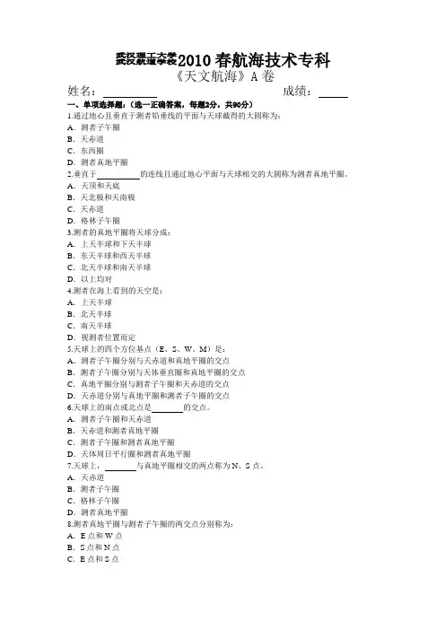 春航海技术专科《天文航海》A卷姓名:成绩:一、单项选择题:(选一正确答案,每题2分,共90分)1.通过地心且垂直于测者铅垂线的平面与天球截得的大圆称为:A.测者子午圈B.天赤道C.东西圈D.测者真地平圈2.垂直于的连线且通过地心平面与天球相交的大圆称为测者真地平圈。