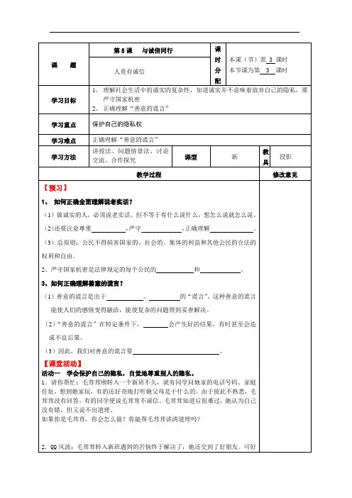 课题第5课与诚信同行课时分配本课(节)需 3 课时本节课为第 3 课时人贵有诚信学习目标1、理解社会生活中的诚实的复杂性,知道诚实并不意味着放弃自己的隐私,要严守国家机密2、正确理解“善意的谎言”学习重点保护自己的隐私权学习难点正确理解“善意的谎言”学习方法讲授法、问题情景法、讨论交流、合作探究课型新教具投影教学过程修改意见【预习】1、如何正确全面理解说老实话?(1)做诚实的人,必须说老实话。