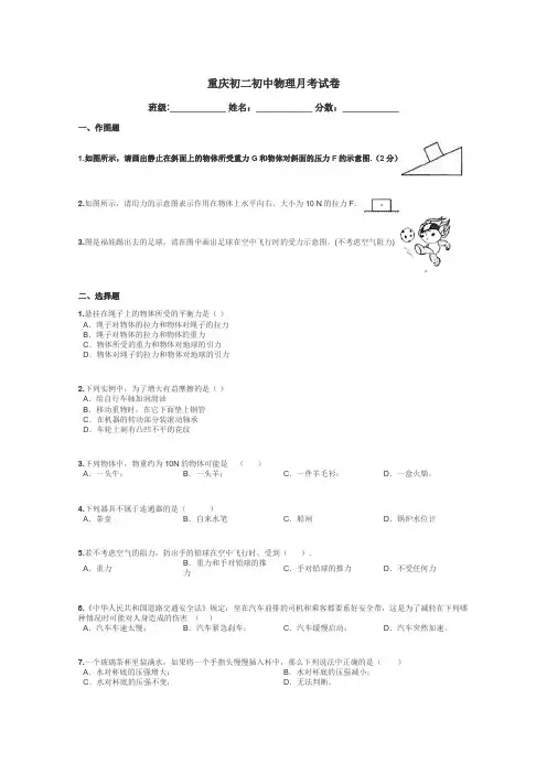 重庆初二初中物理月考试卷班级:___________ 姓名:___________ 分数:___________一、作图题1.如图所示,请画出静止在斜面上的物体所受重力G和物体对斜面的压力F的示意图.(2分)2.如图所示,请用力的示意图表示作用在物体上水平向右、大小为10 N的拉力F。