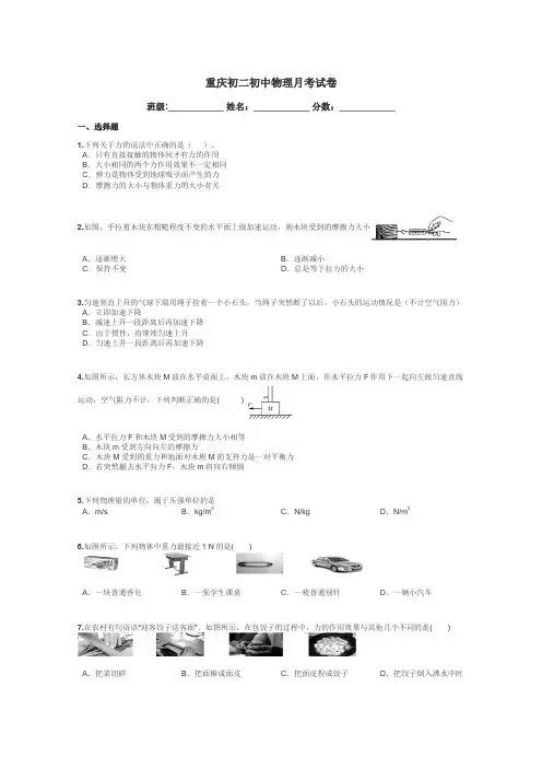 重庆初二初中物理月考试卷班级:___________ 姓名:___________ 分数:___________一、选择题1.在下列事例中,属于减小摩擦的是:()A.自行车刹车时要用力捏闸B.体操运动员上器械前,常常在手上涂些镁粉C.为车轴加润滑油D.在鞋底上制出凹凸不平的花纹2.一辆自行车在水平路面上匀速行驶,如图,以下哪个选项中的力是平衡力()A.人和自行车受到的重力和路面对他们的支持力B.人和自行车受到的重力和地面对他们的摩檫力C.路面对自行车的支持力和自行车对路面的压力D.人和自行车受到的重力及其对路面的压力3.如图所示,将弹簧测力计左端固定在墙上,右端用细线与重力为10N的木块相连,木块放在上表面水平的小车上,弹簧测力计保持水平,现拉动小车沿水平方向做匀速直线运动,木块静止时弹簧测力计的示数为4N,则木块所受摩擦力的大小与方向分别是()A.10N,水平向右B.14N,水平向左C.6N,水平向左D.4N,水平向右4.以下物体所受重力为20N的可能是()A.一个鸡蛋B.一只鸭C.一头牛D.物理课本5.下列关于增大或减小压强的方法说法正确的是()A.推土机的履带是通过增大受力面积来增大压强的B.篆刻刀的刀头是通过减小受力面积来增大压强的C.玻窗锤仅仅是通过增大压力来增大压强的D.火车轨道是通过增大受力面积来增大压强的6.如图所示的活动过程中,其中一个力的作用效果与其他三个不同类,它是()A .B .C .D .7.下列现象中物体运动状态没有发生改变的是( ) A .做匀速圆周运动的人造地球卫星 B .匀速直线下落的跳伞运动员 C .关闭发动机后正向前滑行的汽车D .荡秋千的小朋友8.正在运动的物体,如果他所受的外力同时消失,那么它将( ) A .立即停下来 B .速度逐渐减小,最后停止 C .开始做匀速直线运动 D .速度大小不变,方向可能改变9.关于力和运动下列说法正确的是( )A .将锤柄在石墩上撞击几下,松动的锤头就紧套在锤柄上,这是利用了锤柄的惯性B .竖直向上抛出后的排球,在空中向上运动的过程中受到的合力方向向上C .踢出去的足球还能在水平地面上继续运动,是因为惯性的作用D .物体的运动状态发生改变,该物体一定受到力的作用二、计算题如图甲是西南大学校内的一座塑像,其基座结构类似于图乙和丙的模型。