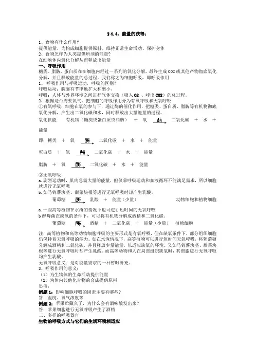 §4.4、能量的获得:1、食物有什么作用?提供能量、为构成细胞提供原料、维持正常生命活动、保护身体2、食物怎样为人类提供所须的能量?在细胞体内氧化分解从而释放出能量一、呼吸作用糖类、脂肪、蛋白质在在细胞内经过一系列的氧化分解,最终生成CO2或其他产物彻底氧化分解,并且释放能量的总过程。