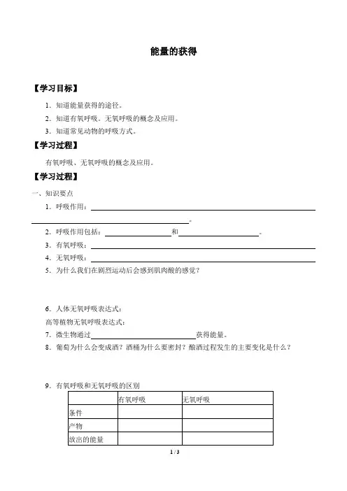 4.4 能量的取得一、学习目标1、明白什么叫有氧呼吸、无氧呼吸。