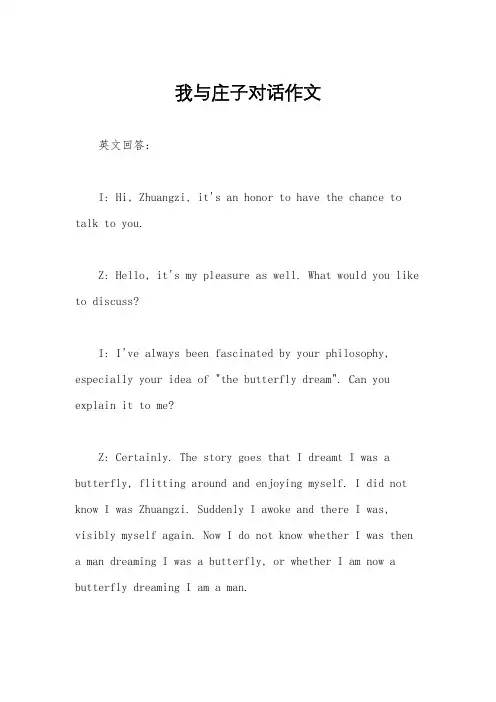 与庄子对话初一作文800字与庄子对话初一作文800字庄周先生,非常钦佩您的博学才智,给后代的我们留下了无比珍贵的精神财富。