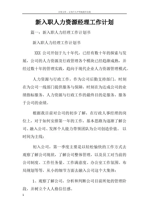 新入职人力资源经理工作计划篇一:新入职人力经理工作计划书新入职人力经理工作计划书XXX公司开创于九十年代,已经有数十年的探索与发展,公司的人力资源及行政管理各个模块已经趋渐成熟,并经过数十年的管理实践,趋向于现代企业人力资源管理模式。
