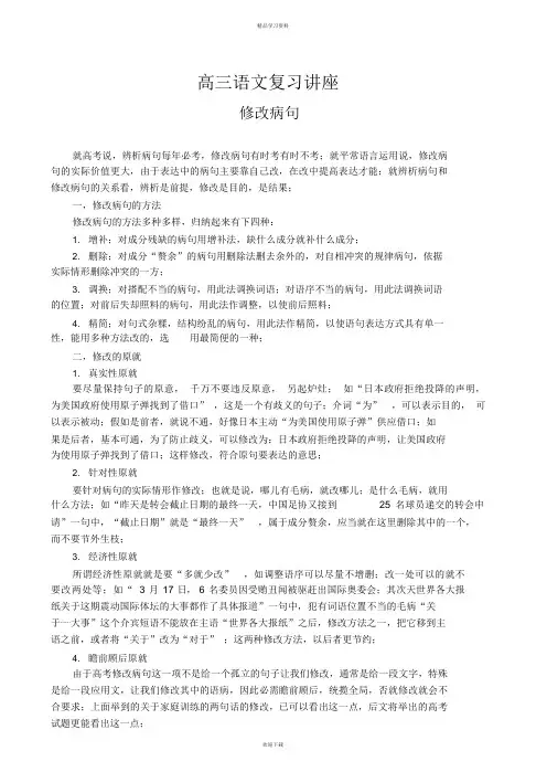 高三语文复习讲座修改病句就高考说,辨析病句每年必考,修改病句有时考有时不考;就平常语言运用说,修改病句的实际价值更大,由于表达中的病句主要靠自己改,在改中提高表达才能;就辨析病句和修改病句的关系看,辨析是前提,修改是目的,是结果;一,修改病句的方法修改病句的方法多种多样,归纳起来有下四种:1. 增补;对成分残缺的病句用增补法,缺什么成分就补什么成分;2. 删除;对成分“赘余”的病句用删除法删去余外的,对自相冲突的规律病句,依据实际情形删除冲突的一方;3. 调换;对搭配不当的病句,用此法调换词语;对语序不当的病句,用此法调换词语的位置;对前后失却照料的病句,用此法作调整,以使前后照料;4. 精简;对句式杂糅,结构纷乱的病句,用此法作精简,以使语句表达方式具有单一性,能用多种方法改的,选用最简便的一种;二,修改的原就1. 真实性原就要尽量保持句子的原意,千万不要违反原意,另起炉灶;如“日本政府拒绝投降的声明,为美国政府使用原子弹找到了借口” ,这是一个有歧义的句子;介词“为” ,可以表示目的,可以表示被动;假如是前者,就说不通,好像日本主动“为美国使用原子弹”供应借口;如果是后者,基本可通,为了防止歧义,可以修改为:日本政府拒绝投降的声明,让美国政府为使用原子弹找到了借口;这样修改,符合原句要表达的意思;2. 针对性原就要针对病句的实际情形作修改;也就是说,哪儿有毛病,就改哪儿;是什么毛病,就用什么方法;如“昨天是转会截止日期的最终一天,中国足协又接到25 名球员递交的转会申请”一句中,“截止日期”就是“最终一天”,属于成分赘余,应当就在这里删除其中的一个,而不要节外生枝;3. 经济性原就所谓经济性原就就是要“多就少改” ,如调整语序可以尽量不增删;改一处可以的就不要改两处等;如“ 3 月17 日,6 名委员因受贿丑闻被驱赶出国际奥委会;其次天世界各大报纸关于这期震动国际体坛的大事都作了具体报道”一句中,犯有词语位置不当的毛病“关于⋯⋯大事”这个介宾短语不能放在主语“世界各大报纸”之后,修改方法之一,把它移到主语之前,或者将“关于”改为“对于” ;这两种修改方法,以后者更节约;4. 瞻前顾后原就由于高考修改病句这一项不是给一个孤立的句子让我们修改,通常是给一段文字,特殊是给一段应用文,让我们修改其中的语病,因此必需瞻前顾后,统揽全局,否就修改就会不合要求;上面举到的关于家庭训练的两句话的修改,已可以看出这一点,后文将举出的高考试题更能看出这一点;,改为: ,改为: ,改为:三,典型试题分析1. 下面是从一就乱办学的招生广告中摘录出来的话,除内容方面的问题外,在标点,语法,句意表述上也有不少毛病;读后完成后面的两题;①我校是×××捐资百万美元, ②跨省办起三所外语培训学校之一; ③有自己的教学楼, 图书馆,教学设备及老师队伍;④由于办学成果突出,⑤国内外80 多家新闻界报道了我校; ⑥我校饮誉东南亚,⑦除了越南,柬埔寨,⑧某些国家都有姊妹学校;( 1)有毛病的四处是(只填序号), , , ; ( 2)选三处改正a .(只填序号)b .(只填序号)c .(只填序号) 这段摘自招生广告的文字, 从题干可知有标点, 语法,句意表述和内容等多方面的错误;从语法的角度看, “跨省办起三所学校之一”不通,应“办起”后加“的” ,从标点的角度看,③处“教学楼”和“图书馆”都作“有”的并列宾语,中间的逗号应改为顿号;从词语运用的角度看,⑤处“新闻界”前面不解用“多家”作定语;由于前面有“ 80 多家”,应当将“新闻界”改为“新闻单位” ;从内容看,⑧处“东南亚”是一个集合概念,用“某些”修饰“国家”是不恰当的,应改用“很多” ,“一些”等;当然,从答案来说,只要写出其中任意三处就可以了;2. 下面是某校黑板上的一篇报道,在标点,词语,语法等方面都有一些毛病;读后完成( 1)( 2)两题;星期三,校团总支召开座谈会,到会的 15 名与会者,就共青团员如何为社会主义精神文明建设的问题绽开争论; 大家积极发言; 有的说, 团员第一要起模范作用, 当说话做事前, 都要想到自己是一名团员;有的说,要提高团员精神文明建设的意识,不把这一点重视好,就难以开展这项活动;团总支书记最终指出,对有利于精神文明建设的事应当大力提倡;对不尽人意的地方应当留意改进;( 1)找出文中的毛病,在它们下面划上横线,并标出①②⋯⋯序号;( 2)把序号和改正结果填入表中;修改时不能转变原意(如将正确处改错要扣分)以下表格略;从命题的角度看,把此题和上题联系起来看,可以发觉以下特点:其一,要修改一段文字的几处毛病;其二,这一段文字往往是应用文字,前面是广告词,这里是报道;其三材料来自现实生活,有时代气息;这篇报道有 7 处错误,错误情形及修改意识如下:①“到会的15 名与会者”有赘余的毛病,保留“到会的”就应将“与会者”改为“共青团员”或“同学”;保留“与会者”就 要去掉“到会的”;②就共青团员如何为社会主义精神文明建设的问题绽开争论中, “为⋯⋯” 这一介宾结构中缺中心语“作奉献” ,属于成分残缺,应改为“为社会主义精神文明建设作奉献”;③“当说话做事前”的“当”字赘余;如要保留这样的结构,应是“在⋯⋯前” ;④ 提高团员精神文明建设的意识”搭配不当,与“提高”搭配的,应是“熟悉”,与“意识” 搭配的应为“加强,