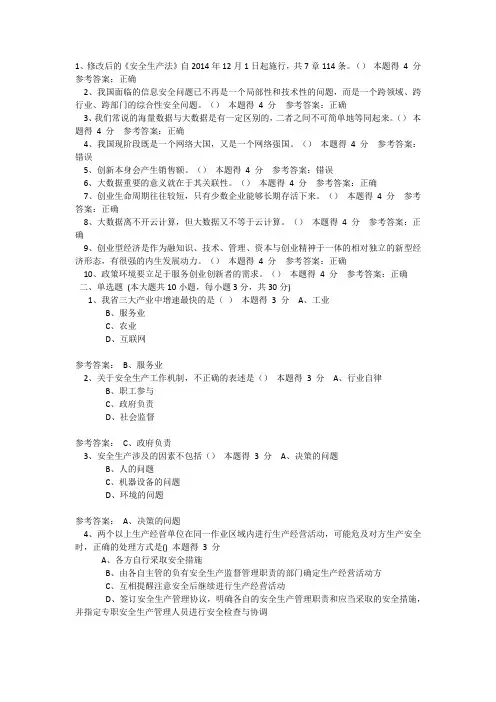 ()本题得4 分参考答案:正确二、单选题(本大题共10小题,每小题3分,共30分)1、我省三大产业中增速最快的是()本题得3 分A、工业B、服务业C、农业D、互联网参考答案:B、服务业2、关于安全生产工作机制,不正确的表述是()本题得3 分A、行业自律B、职工参与C、政府负责D、社会监督参考答案:C、政府负责3、安全生产涉及的因素不包括()本题得3 分A、决策的问题B、人的问题C、机器设备的问题D、环境的问题参考答案:A、决策的问题4、两个以上生产经营单位在同一作业区域内进行生产经营活动,可能危及对方生产安全时,正确的处理方式是() 本题得3 分A、各方自行采取安全措施B、由各自主管的负有安全生产监督管理职责的部门确定生产经营活动方C、互相提醒注意安全后继续进行生产经营活动D、签订安全生产管理协议,明确各自的安全生产管理职责和应当采取的安全措施,并指定专职安全生产管理人员进行安全检查与协调参考答案:D、签订安全生产管理协议,明确各自的安全生产管理职责和应当采取的安全措施,并指定专职安全生产管理人员进行安全检查与协调5、王某为某国有矿山的主要负责人,下列关于叶某在安全生产方面的职责的表述,不正确的是() 本题得3 分A、亲自为职工讲授安全生产培训课程B、组织制定本单位的事故应急救援预案C、组织制定本单位的安全生产规章制度D、保证本单位安全生产投人的有效实施参考答案:A、亲自为职工讲授安全生产培训课程6、2014年2月27日,()宣告成立,由中国最高领导人出任领导小组组长,规格高、力度大、立意远,兼顾到国防军事、国务院系统及意识形态三个安全战略规划,更有力、更权威地统筹指导中国迈向网络强国的发展战略,揭开了中国信息化新篇章。