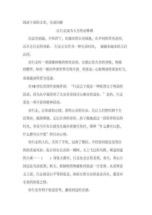 (《桃花源记》)二、现代文阅读(本大题共2小题,共40.0分)2.阅读下文,完成下列各题让行走成为人生的必修课①晨光初露,夕阳西下,在城市的公共绿地,在乡间的草丛花径,总不乏行走的身影。
