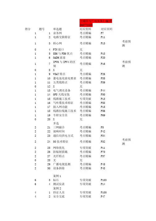 《通信与广电实务》QQ群493772250得分题号单选题对应资料对应页码1 1 业务网考点精编P71 2 电路交换特征考点精编P111 3 核心网考点精编P13 考前预测0 4 PTN接口无1 5 SDH与PDH优点考点精编P18 1 6 OADM波道考点精编P201 7 IPV6与IPV4的区别考点精编P16考前预测0 8 X 无1 9 VSAT特点考点精编P26 1 10 蓄电池充放电要求考点精编P35 1 11 五类线特点考点精编P390 12 X 无1 13 电气调光设备考点精编P44 1 14 GPS天线安装考点精编P50 1 15 线路施工技术专项突破P13 1 16 气吹缆技术特征考点精编P58 1 17 接入网功能考点精编P15 1 18 线路拉线施工技术考点精编P56 1 19 专职安全员考点精编P69 0 20 X 无多选2 21 三网融合考点精编P5 2 22 混响时间考点精编P42 2 23 通信局供电方式考点精编P342 24 5G技术特征考点精编P32 考前预测2 25 网络优化专项突破P11 2 26 防辐射措施考点精编P70 2 27 光纤特点考点精编P37 0 28 无无2 29 广播电视监测考点精编P45 2 30 设备拆除考点精编P48案例16 3 标石专项突破P103 6 4 测试仪表专项突破P14案例24 1 持证人员专项突破P100 4 2 安全交底专项突破P474 3 高空作业专项突破P503 4 电源线接地考点精编P51+P52 2 5 工程保修期专项突破P92案例34 1 临时设施设置原则专项突破P184 2 光缆检测专项突破P134 3 吊线质量控制点专项突破P574 4 架空缆线安全距离考点精编P72案例44 1 计算专项突破P36,P39 6 2 计算专项突破P36,P39 6 3 计算专项突破P36,P39 6 4 计算专项突破P36,P395 5 竣工文件专项突破P903 6 施工图签字专项突破P90案例五3 1 施工工序专项突破P252 计算专项突破3 计算专项突破4 计算专项突破5 计算专项突破6 6 分析专项突破4 7 监理方式专项突破P101 122。
