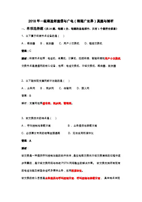 2018年一级建造师通信与广电(海南广东券)真题与解析一、单项选择题(共20题,每题1分,每题的备选项中,只有1个最符合原意)1、以下属于终端节点设备的是()A 、路由器B 、转发器C、用户小交换机D、程控交换机答案:C解析:终端节点包括:电话机、传真机、计算机、视频终端、智能终端和用户小交换机交换节点是通信网的核心设备,包括:电话交换机、分组交换机、路由器、转发器2、以下能实现支撑网部分功能的是()A 、业务网B 、同步网C、传输网D、接入网答案:B解析:支撑网包括信令网、同步网、管理网。