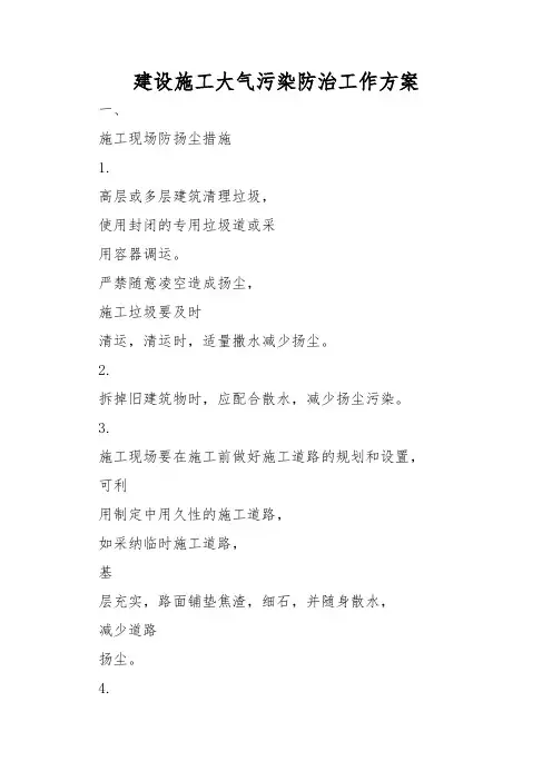 建设施工大气污染防治工作方案一、施工现场防扬尘措施1.高层或多层建筑清理垃圾,使用封闭的专用垃圾道或采用容器调运。