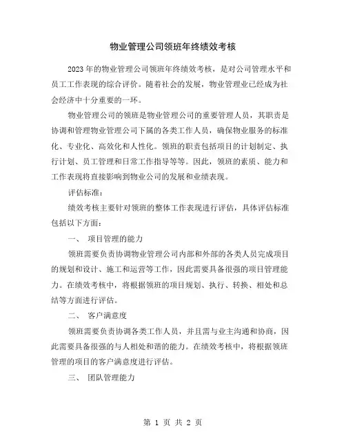 物业管理公司领班年终绩效考核2023年的物业管理公司领班年终绩效考核,是对公司管理水平和员工工作表现的综合评价。