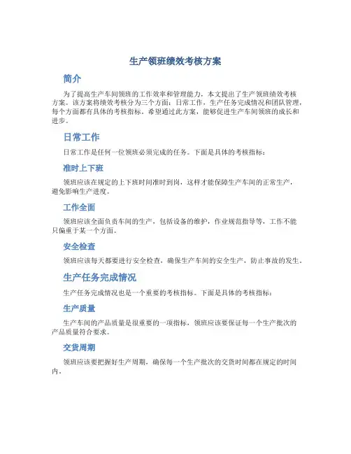 生产领班绩效考核方案简介为了提高生产车间领班的工作效率和管理能力,本文提出了生产领班绩效考核方案。