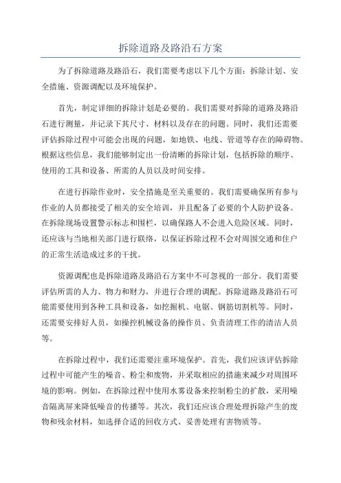 3. 拆除过程的注意事项在进行路沿石拆除的过程中,需要注意以下事项:•拆除顺序:根据实际情况,确定拆除路沿石的顺序。