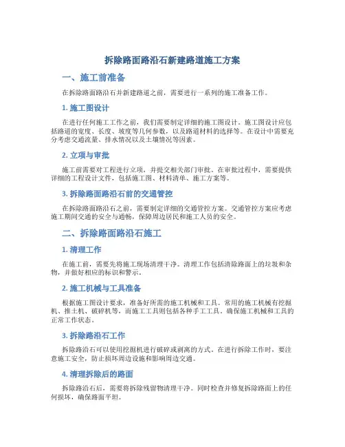 二、拆除路面路沿石施工1. 清理工作在施工前,需要先将施工现场清理干净。