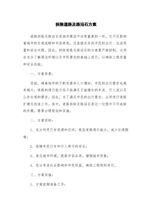 拆除道路及路沿石方案为了拆除道路及路沿石,我们需要考虑以下几个方面:拆除计划、安全措施、资源调配以及环境保护。
