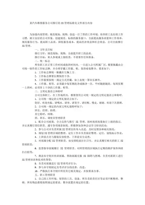 某汽车维修服务公司推行的5S管理标准化文件部分内容为加强内部管理,规范现场、现物,创造一目了然的工作环境,培养职工良好的工作习惯,树立良好的公司形象,创建规范、标准的服务窗口,全面提高服务质量和工作效率,规范服务行为,提高职工品质,降低服务成本,提高经济效益和社会效益,公司全面推行5S管理。