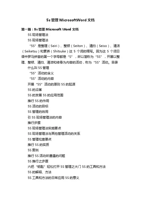 5s管理MicrosoftWord文档第一篇:5s管理Microsoft Word 文档5S现场管理法5S现场管理法“5S”是整理(Seiri)、整顿(Seiton)、清扫(Seiso)、清洁(Seiketsu)和素养(Shitsuke)这5个词的缩写。