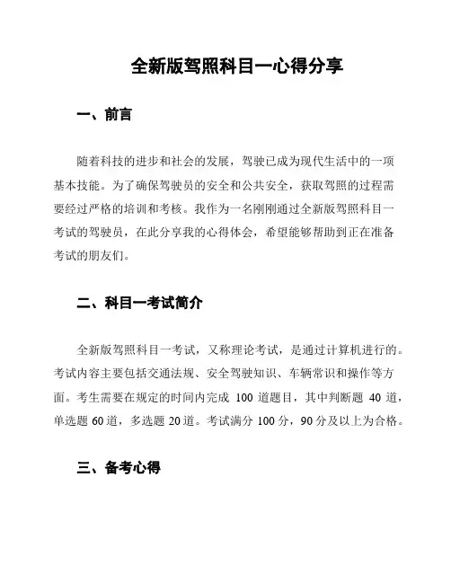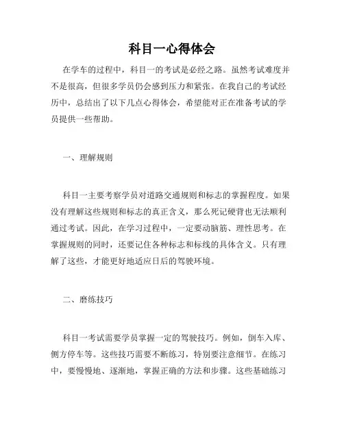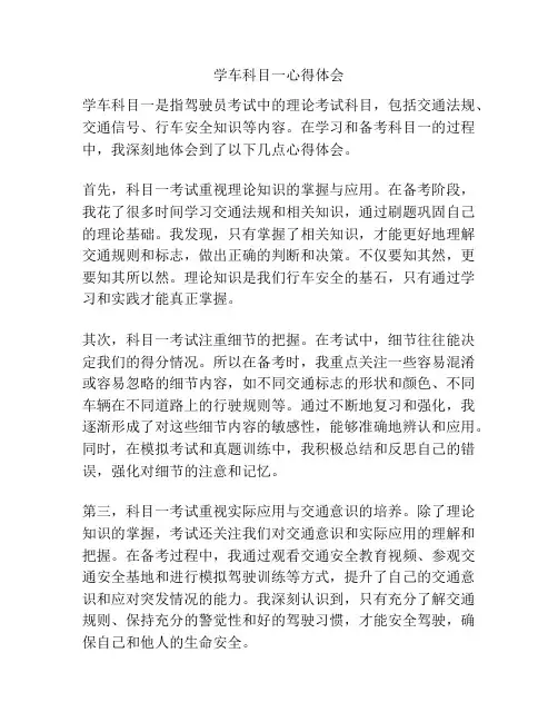 三、心得体会1. 理解法规,提高安全意识通过学习科一考试内容,我深刻认识到交通安全的重要性。