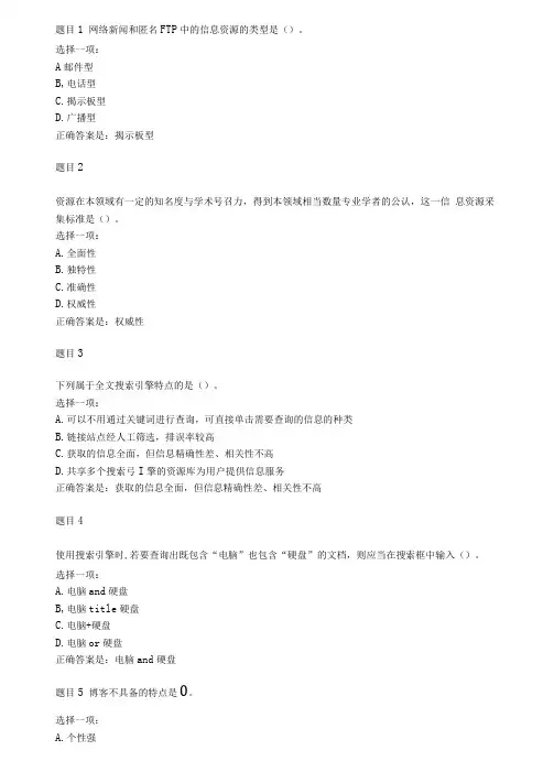 选择一项:A.可以不用通过关键词进行查询,可直接单击需要查询的信息的种类B.链接站点经人工筛选,排误率较高C.获取的信息全面,但信息精确性差、相关性不高D.共享多个搜索弓I擎的资源库为用户提供信息服务正确答案是:获取的信息全面,但信息精确性差、相关性不高题目4使用搜索引擎时,若要查询出既包含“电脑”也包含“硬盘”的文档,则应当在搜索框中输入()。