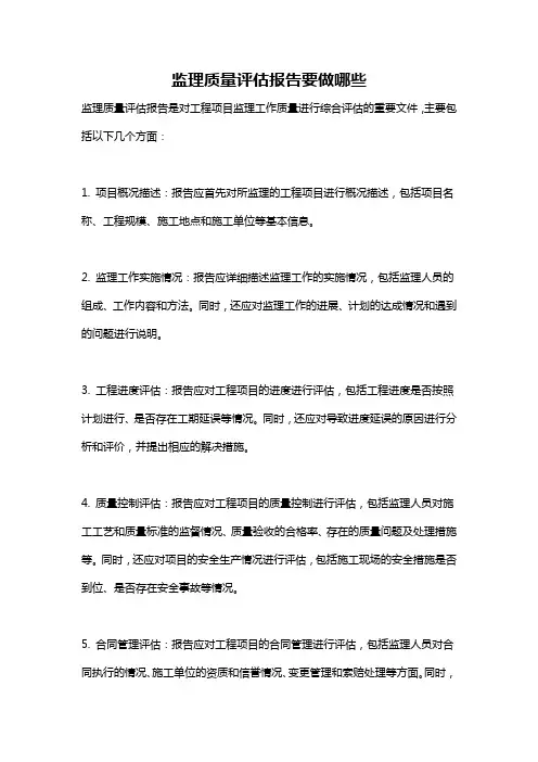 二、监理质量评估报告的内容要求2.1 工程项目概况:监理质量评估报告应包括工程项目的基本情况、建设单位信息、监理单位信息等。
