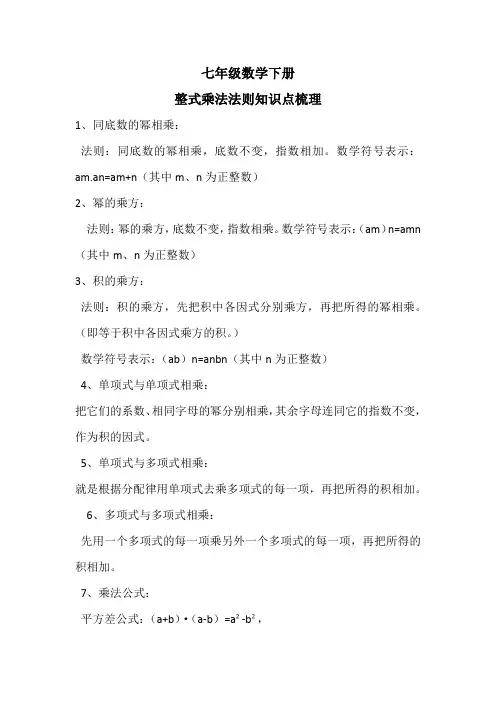6、单项式的乘法法则对于三个或三个以上的单项式相乘同样适用完全平方公式:1、(a±b)=a±2a b+b即:两数和(或差)的平方,等于它们的平方和,加上(或减去)它们的积的2倍。