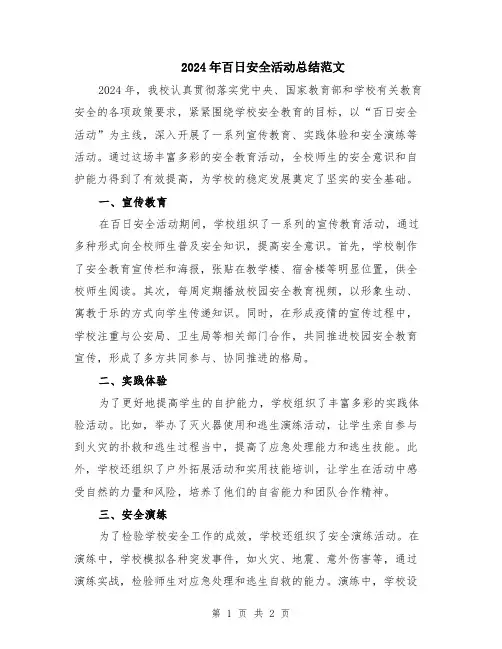 2024年百日安全活动总结范文2024年,我校认真贯彻落实党中央、国家教育部和学校有关教育安全的各项政策要求,紧紧围绕学校安全教育的目标,以“百日安全活动”为主线,深入开展了一系列宣传教育、实践体验和安全演练等活动。