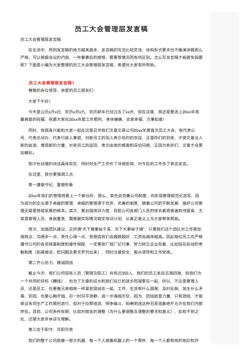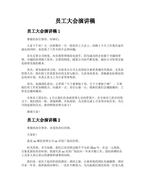 全体员工朋友们,1月让我们在各级管理人员的带领下,在全体员工的共同努力下,我们团结一致、顽强拚搏、开拓进取,为全面完成1月各项目标任务,为公司创造新的历史、新的辉煌而努力奋斗!谢谢大家!员工大会演讲稿2尊敬的各位领导,亲爱的各位同事:大家好!我是xx餐饮管理公司xx宾馆广场店经理。