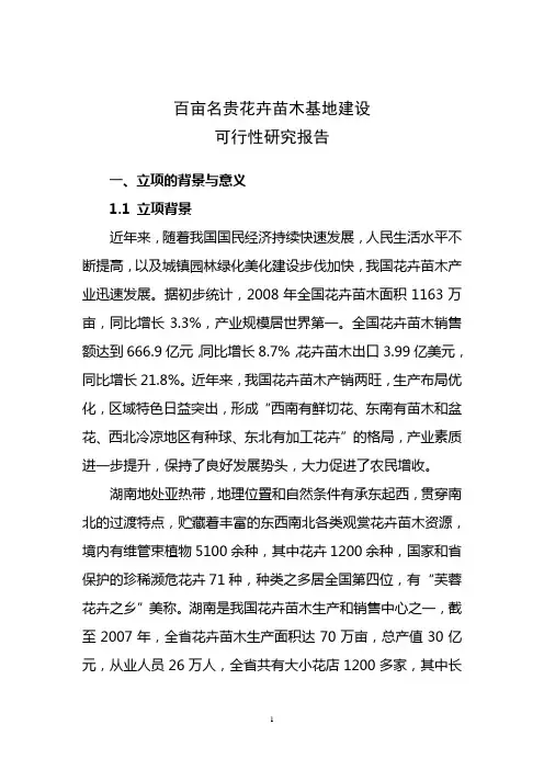 百亩名贵花卉苗木基地建设可行性研究报告一、立项的背景与意义1.1 立项背景近年来,随着我国国民经济持续快速发展,人民生活水平不断提高,以及城镇园林绿化美化建设步伐加快,我国花卉苗木产业迅速发展。