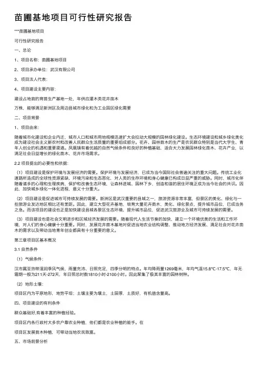 苗圃基地项⽬可⾏性研究报告***苗圃基地项⽬可⾏性研究报告⼀、总论1、项⽬名称:苗圃基地项⽬2、项⽬承办单位:武汉有限公司3、项⽬法⼈代表:4、项⽬建设主要内容:建设占地亩的育苗⽣产基地⼀处,年供应灌⽊类花卉亩⽊万株,能够满⾜新洲区及周边县城市绿化和为⼯业园区绿化需要⼆、项⽬背景1、项⽬由来:随着城市化建设和企业内迁,城市⼈⼝和城市⽤地规模迅速扩⼤会拉动⼤规模的园林绿化建设。