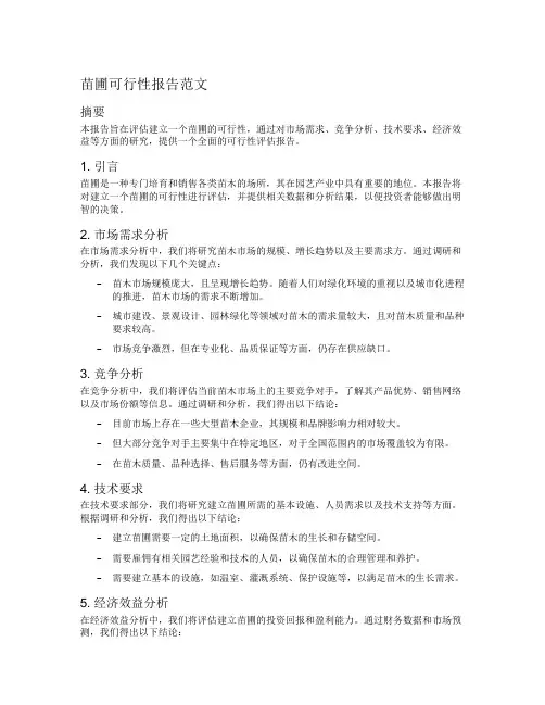 苗圃可行性报告范文摘要本报告旨在评估建立一个苗圃的可行性,通过对市场需求、竞争分析、技术要求、经济效益等方面的研究,提供一个全面的可行性评估报告。